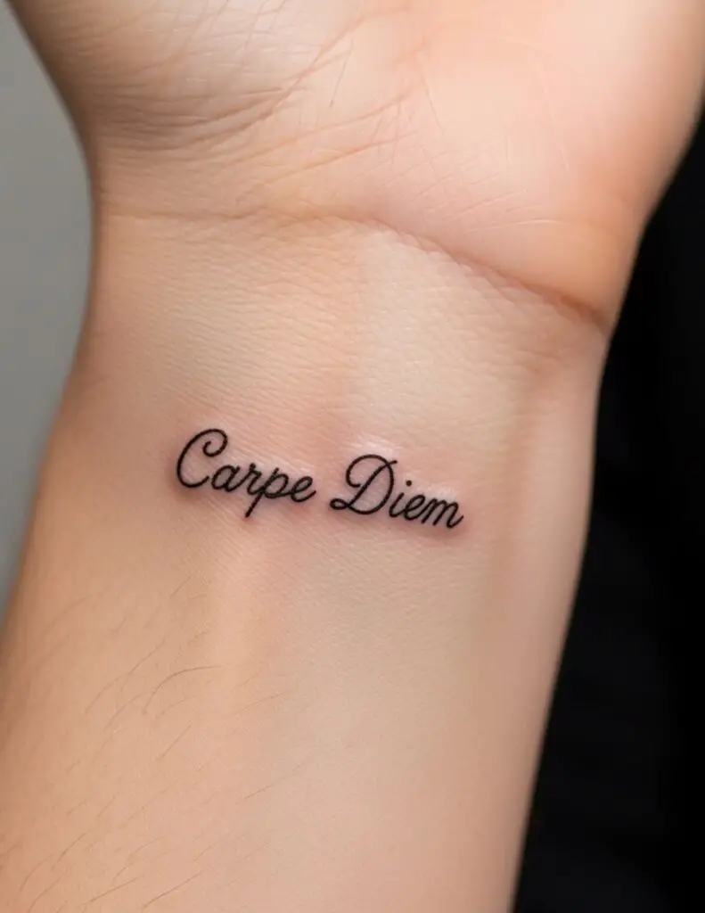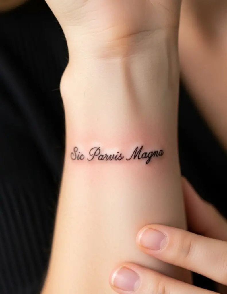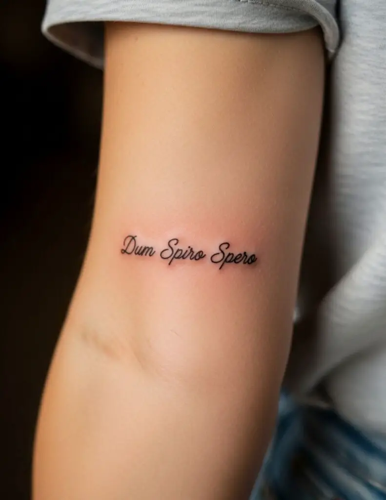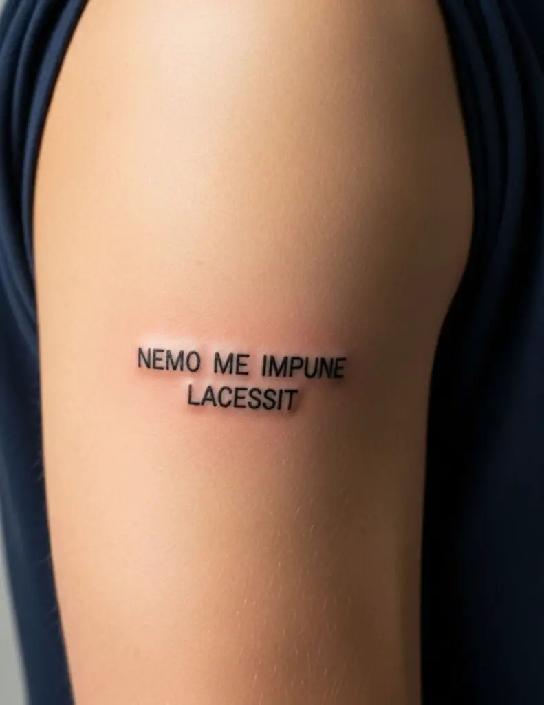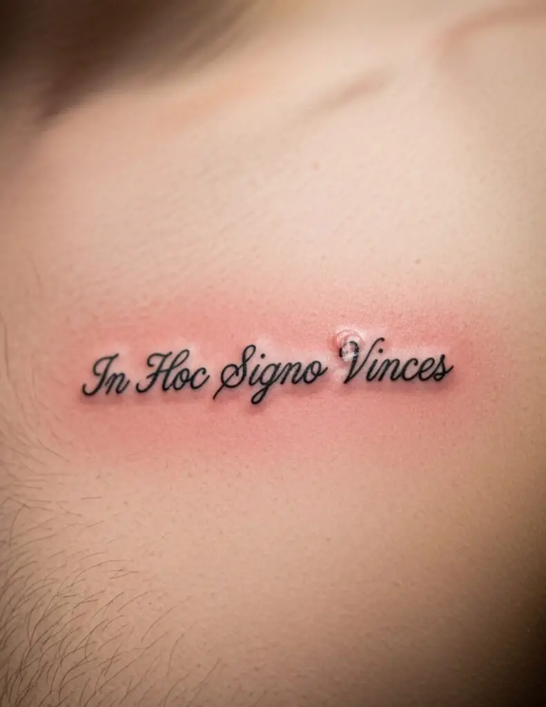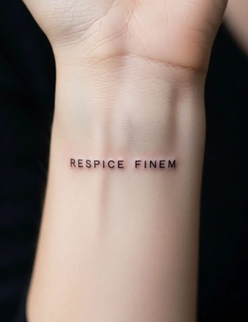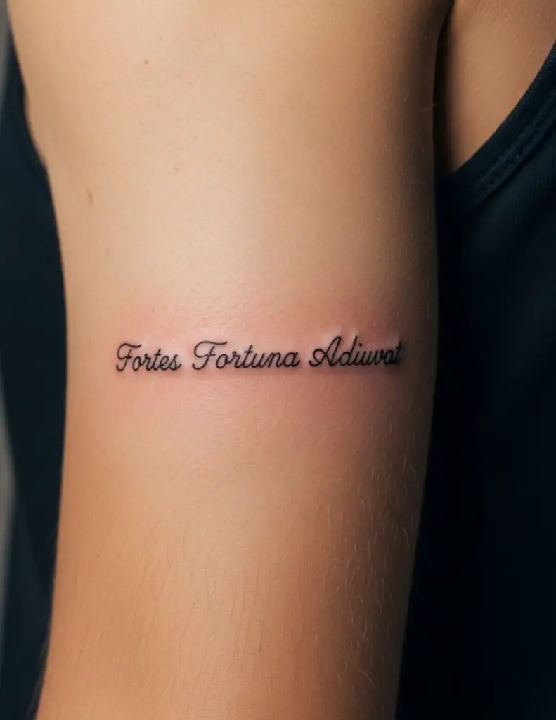 Latin phrase tattoos are typically done in script: cursive letterforms that reference handwriting and the manuscript tradition Latin actually comes from. The script choice matters as much as the words. Serif script references Roman stone inscriptions. Cursive script references the humanist manuscripts of the Renaissance. Discuss the aesthetic associations of different scripts with your artist before settling on a style.