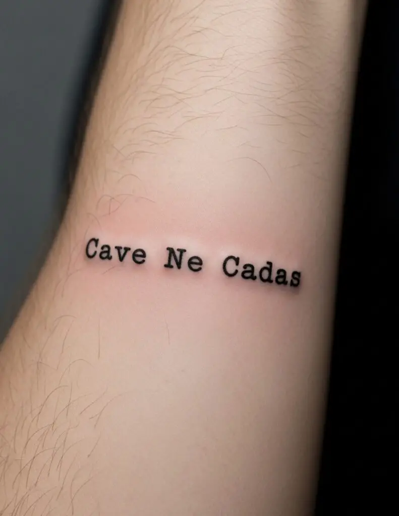 “Beware lest you fall.” A Stoic caution against hubris. The awareness that success and position are temporary and that pride precedes collapse. An unusual choice for a Latin tattoo, suggesting self-awareness rather than triumph.