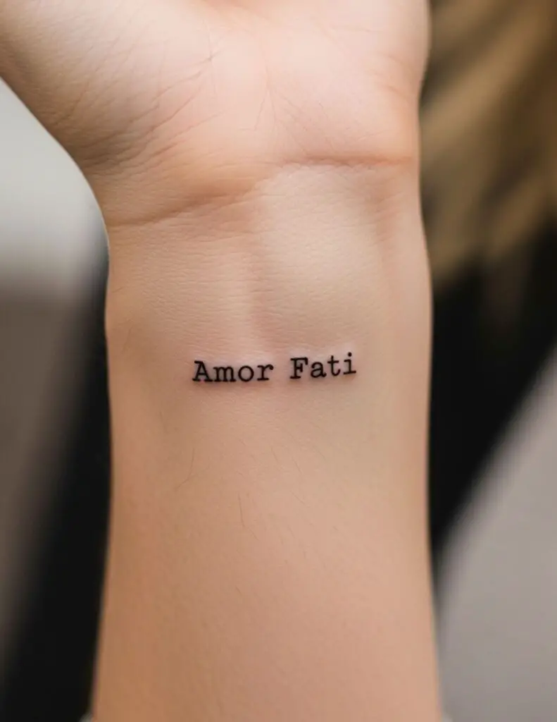 “Love of fate.” The Nietzschean phrase for embracing everything that happens, the good and the painful alike, as part of what is. Not mere acceptance but active love of what is. Compact enough for wrist or inner forearm placement.