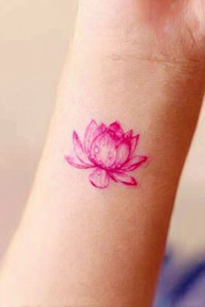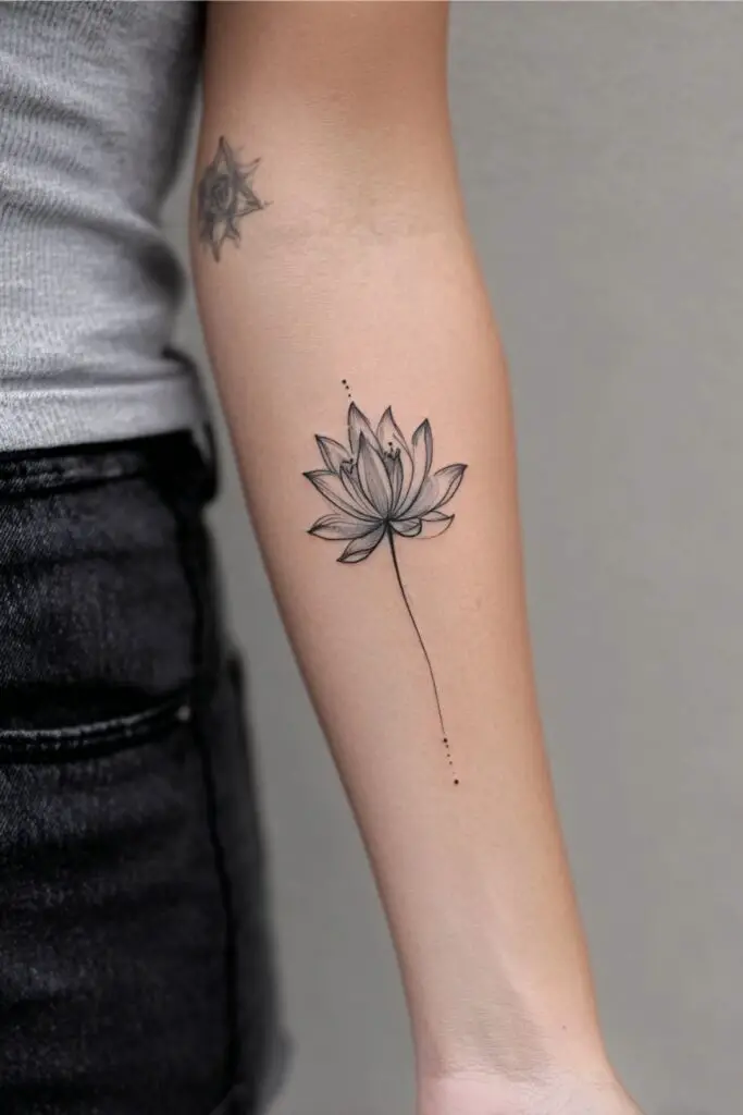 This subtle approach emphasizes purity, balance, and spiritual growth in a timeless, sophisticated way. The minimalism allows the tattoo to blend effortlessly with the skin, making it perfect for small and discrete placements like the wrist, behind the ear, or finger. This design invites quiet reflection and symbolizes inner peace and resilience, representing the power of simplicity to convey profound meaning and beauty.