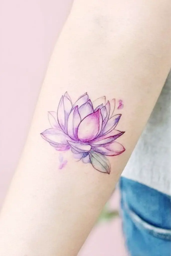A watercolor lotus tattoo with soft blended pinks and purples bursts into life like a dreamlike dawn on the skin, where petals unfurl in hazy gradients of rosy blush fading seamlessly into violet whispers.