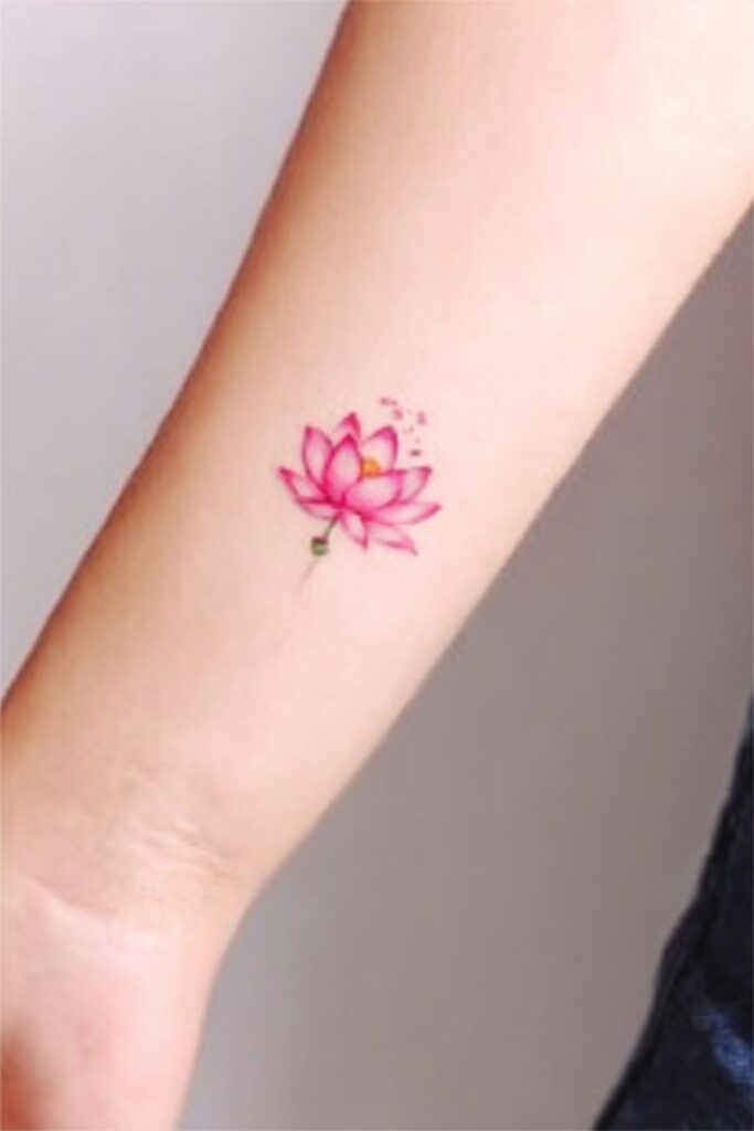 A fully bloomed lotus tattoo with tiny water droplets on the petals captures the essence of serene emergence and pristine vitality, showcasing wide-open petals in soft pink or white hues that unfurl gracefully from a slender stem.