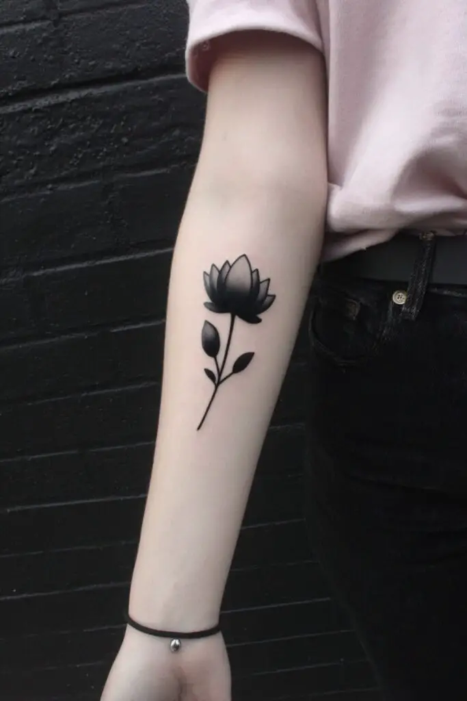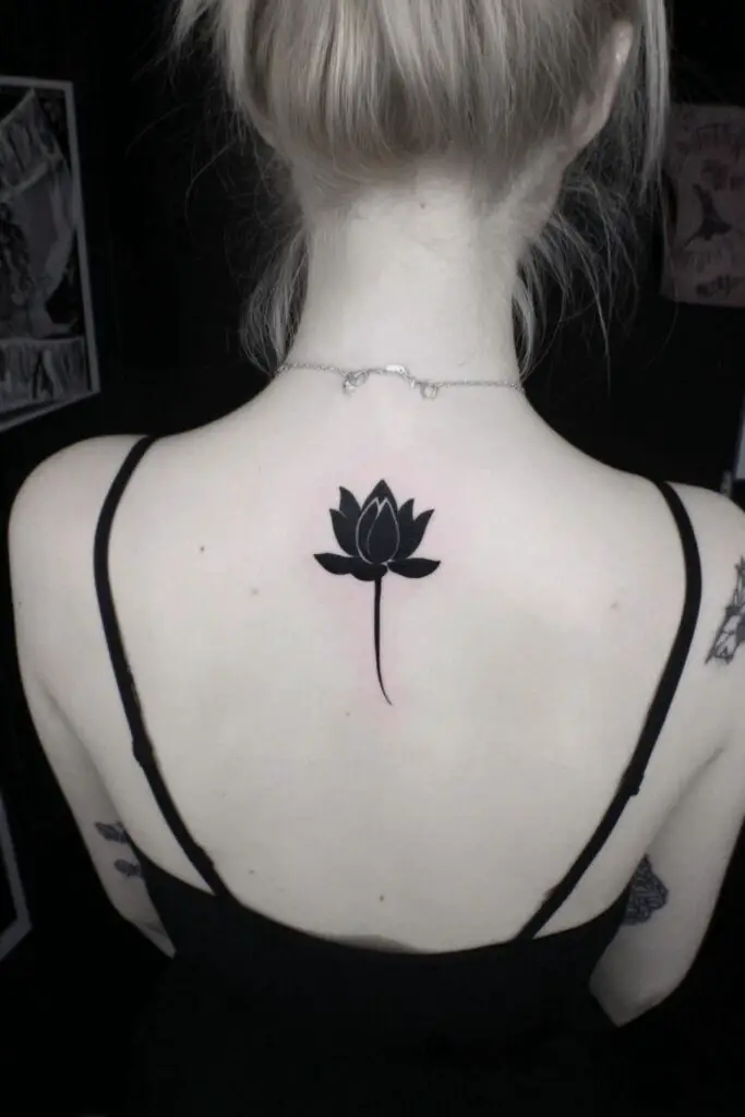 A blackout lotus tattoo delivers bold, dramatic intensity through solid black ink filling the entire floral form, creating a striking void that contrasts sharply against the skin’s natural tone.