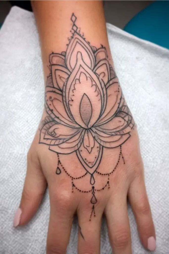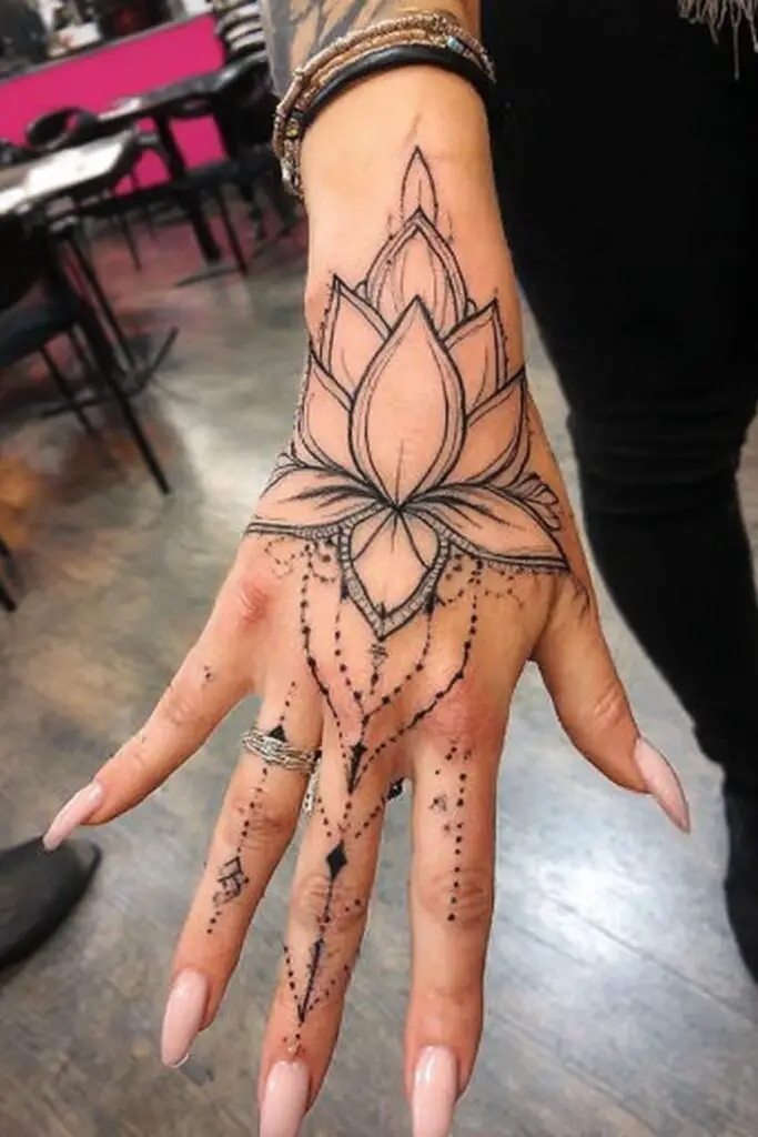 A lotus hand tattoo graces the skin with elegant symbolism of purity and resilience, perfectly suited to the hand’s dynamic canvas where it moves with every gesture.