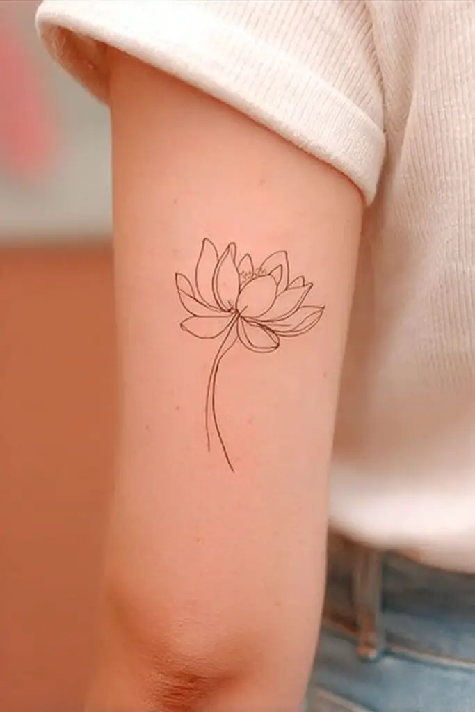 A minimalistic lotus tattoo composed of simple curved lines achieves elegance through clean, understated design. The flower is stylized using a few continuous, flowing lines that form smooth, organic shapes representing the petals, capturing the lotus’s essence without unnecessary detail.