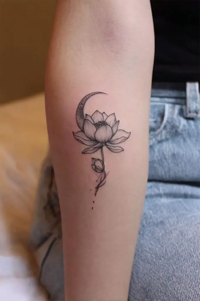 A lotus combined with a crescent moon tattoo weaves ethereal symbolism of transformation and spiritual harmony, where the slender moon arcs gracefully above or cradles the blooming flower in soft, glowing contours.