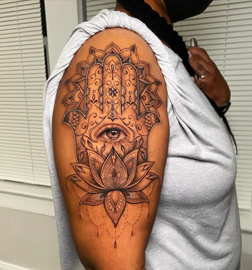 A lotus mandala centred on the shoulder cap: the circular design fitting the round of the shoulder, petals and mandala elements extending down the upper arm and onto the shoulder blade. The shoulder cap placement uses the natural roundness of the shoulder to enhance the mandala’s circular form.