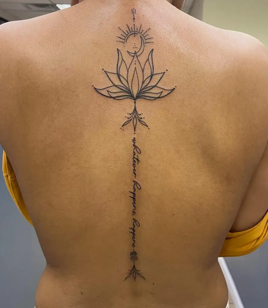 A lotus mandala centred on the upper or lower spine, the circular form sitting perfectly on the vertebral column. The spine placement has natural spiritual associations and places the mandala at the body’s central line. Can extend downward with a small lotus bloom at the base.