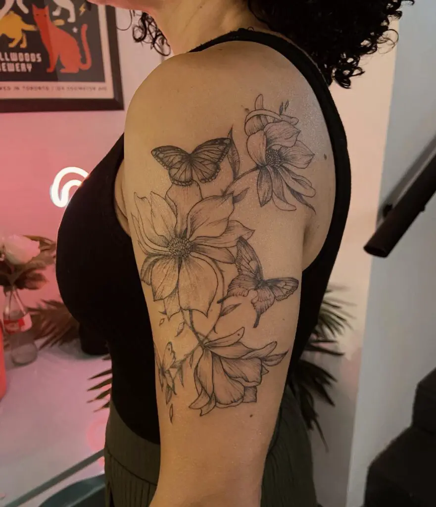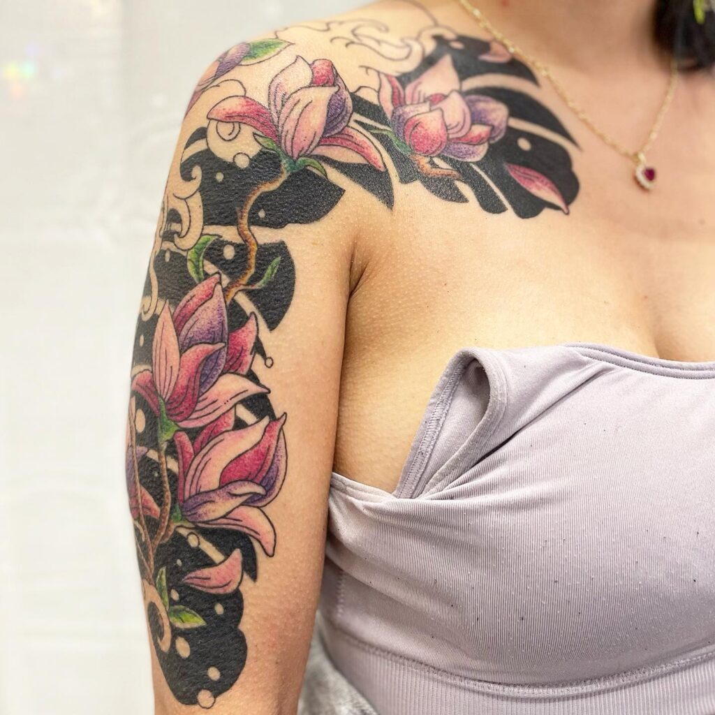 A magnolia branch extending across the shoulder, blooms and buds following the shoulder’s curve from the upper chest toward the arm. The shoulder placement gives the magnolia branch a three-dimensional quality as it wraps from flat chest to rounded shoulder.