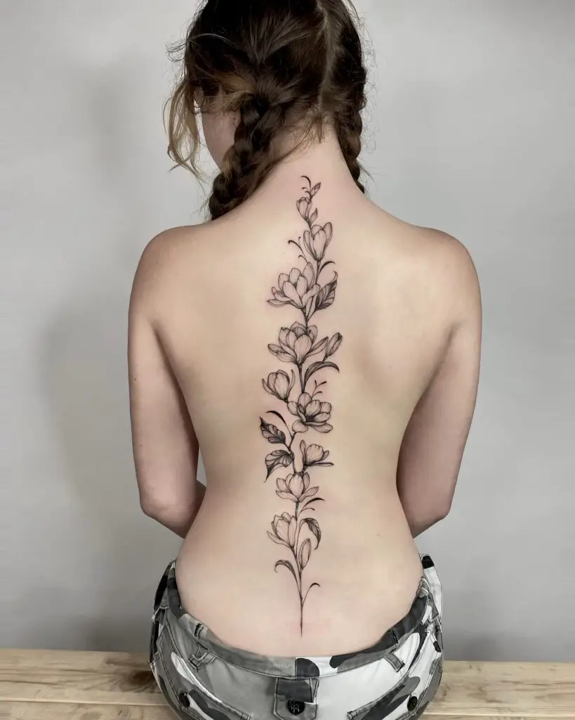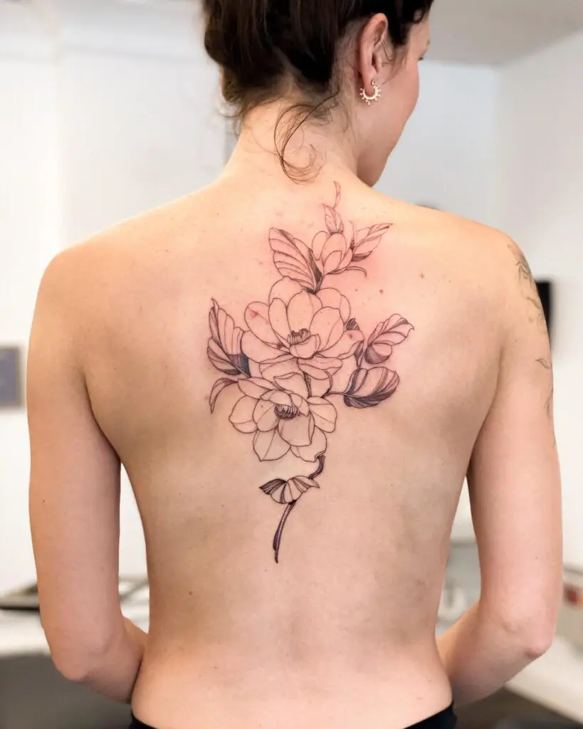 Magnolia branches across the upper back or full back, the flowers at multiple scales creating a composition that uses the back’s broad surface. The magnolia’s large blooms suit back scale: the petals can be rendered with detail at the size the back allows.