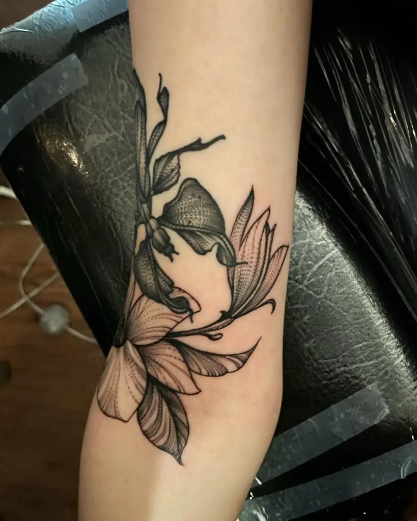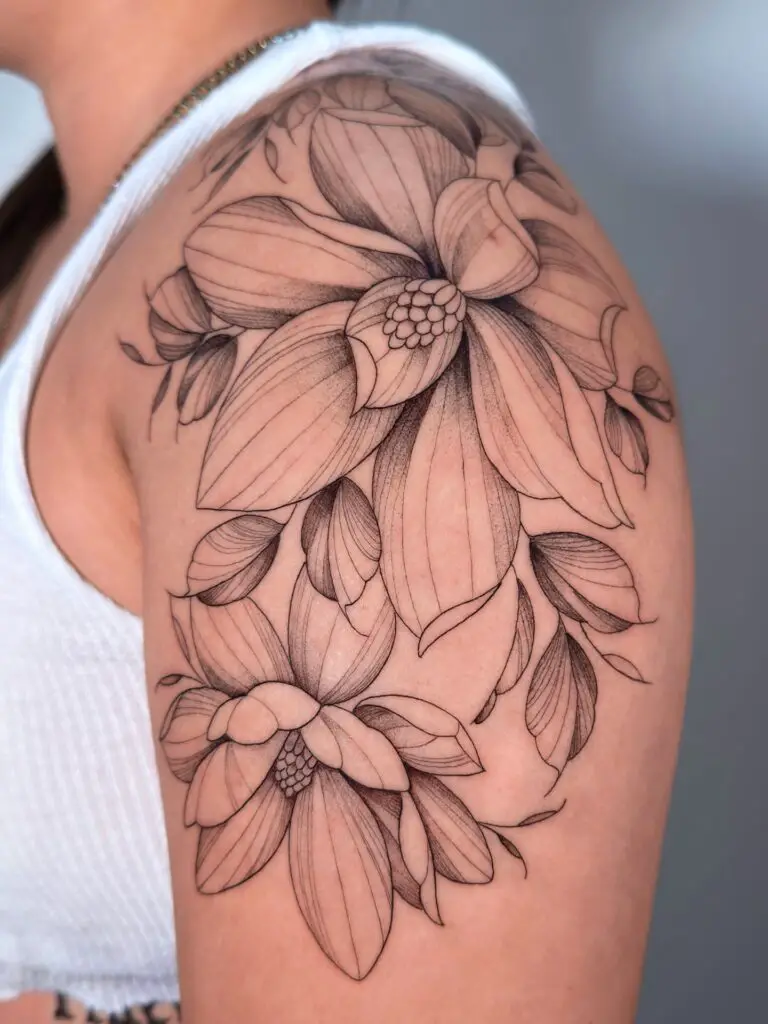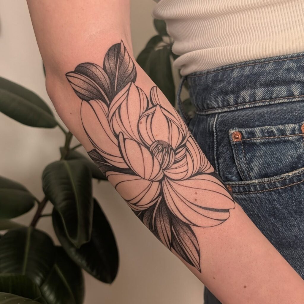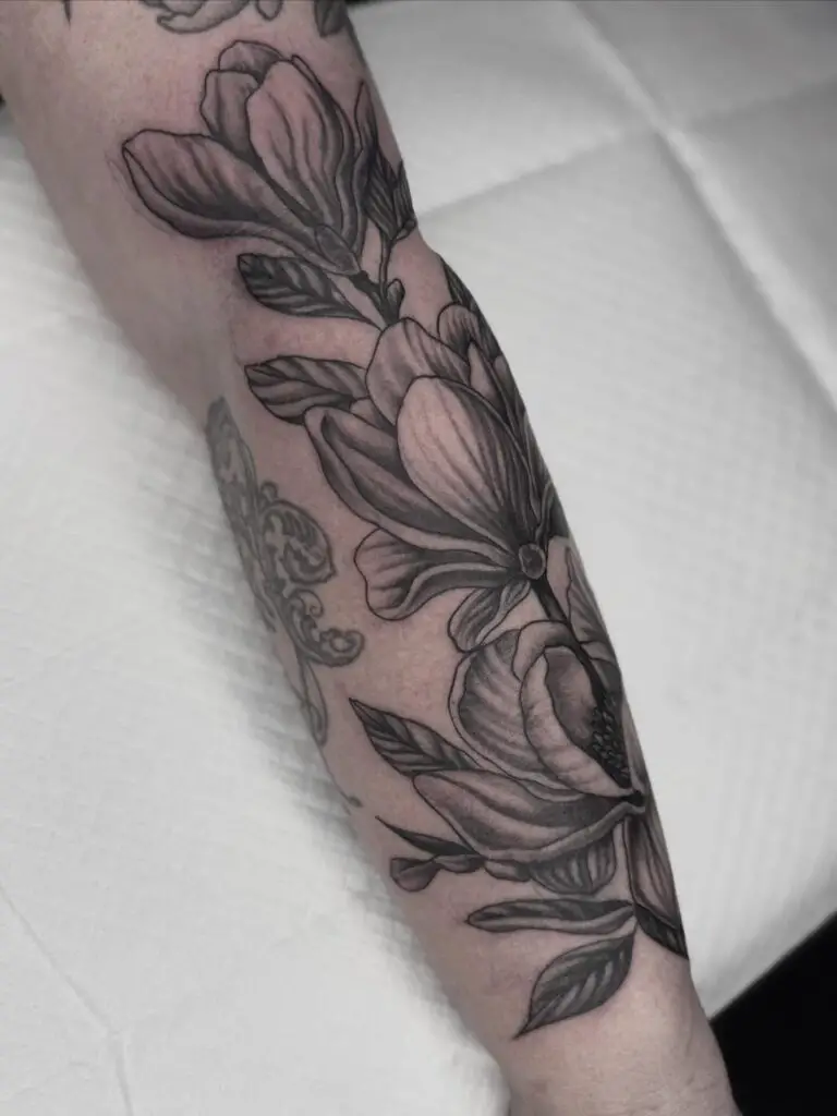 The magnolia is one of the most effective floral subjects for black and grey tattooing because the smooth petal surfaces create ideal conditions for tonal shading. The artist can create depth and luminosity through value contrast alone without requiring colour. If you are considering a magnolia tattoo and are undecided about colour versus black and grey, look specifically at healed black and grey magnolia work: it is consistently one of the most beautiful applications of the style to a botanical subject.