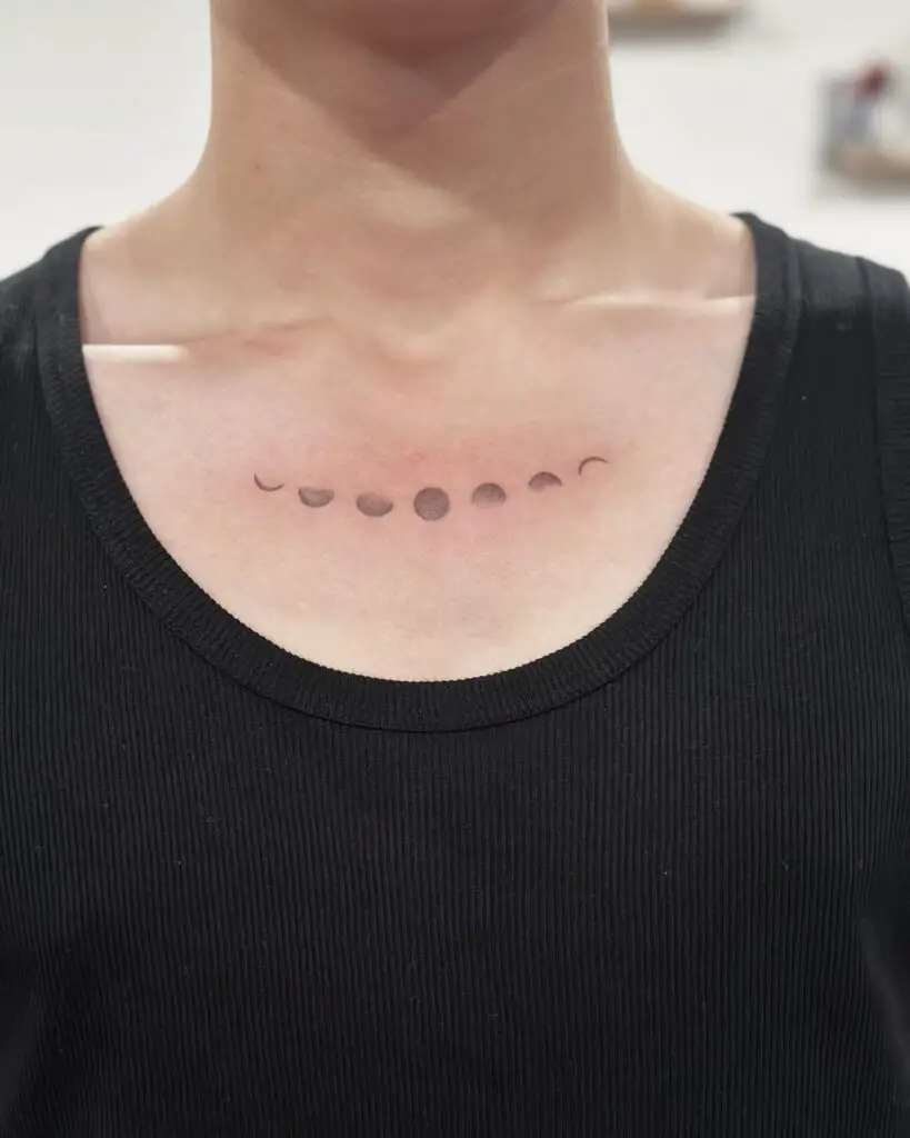Phases arranged across the collarbone area, one phase sitting at each shoulder and the full moon centred at the sternum. This requires commitment but the payoff is a design that transforms the entire chest area.