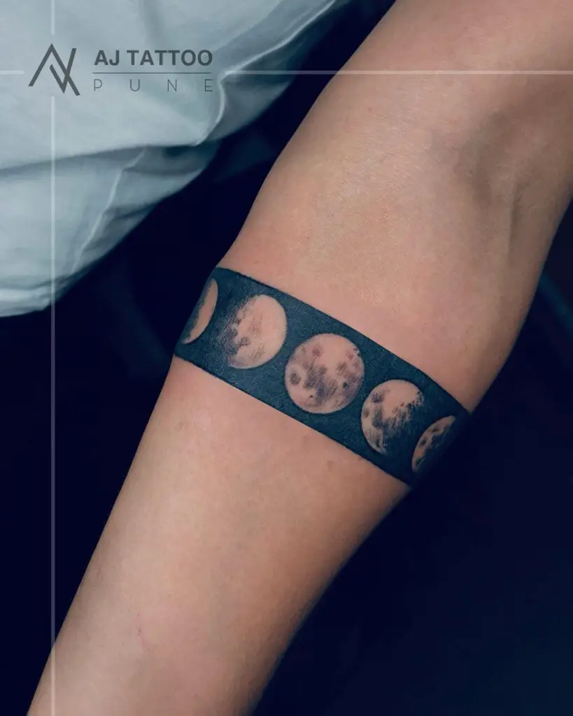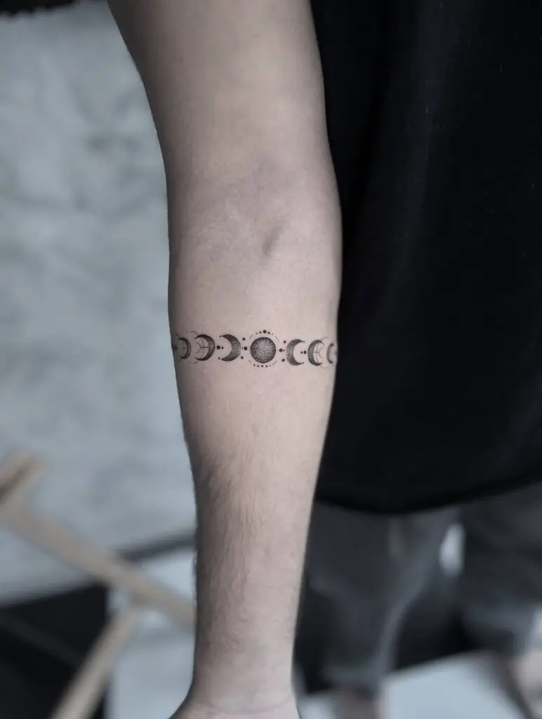A continuous band of phases wrapping around the wrist. Delicate, intricate, and almost jewellery-like. This works best in fine line black ink where each phase is drawn with real precision.