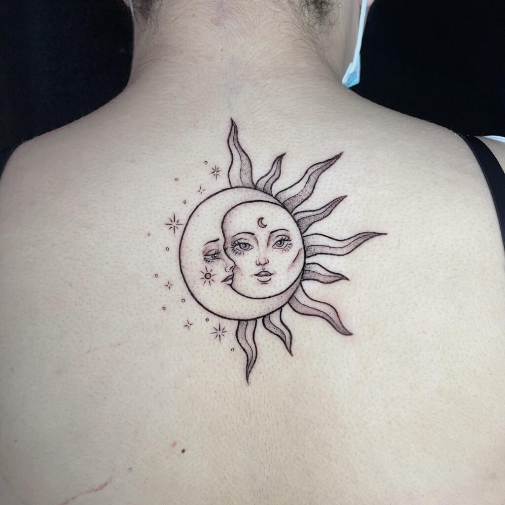 A full moon on one side and a stylised sun on the other, with phases trailing between them. The duality of celestial opposites. Day and night, conscious and unconscious, masculine and feminine energies. A popular concept but executed well, genuinely affecting.
