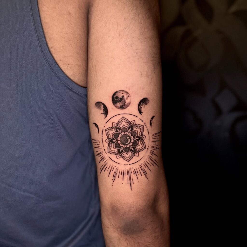 A central full moon expanded into a circular mandala with crescent phases radiating outward like petals. Complex, intricate, and best left to an artist who specialises in this style. The results when done well are extraordinary.