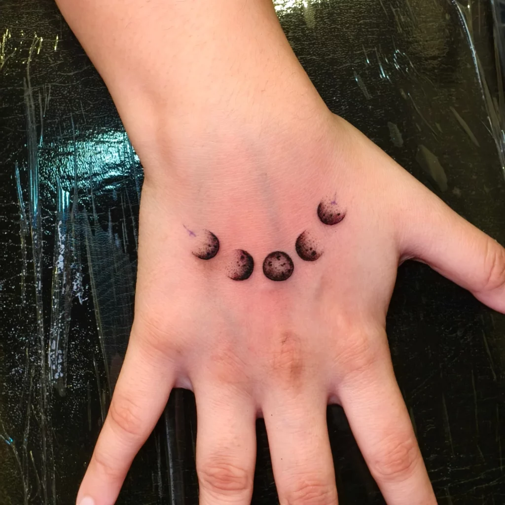 A single crescent or a small phase arc across the back of the hand or along the fingers. Visible, bold, and a choice that signals genuine commitment to the design. This is not a tattoo you hide easily.