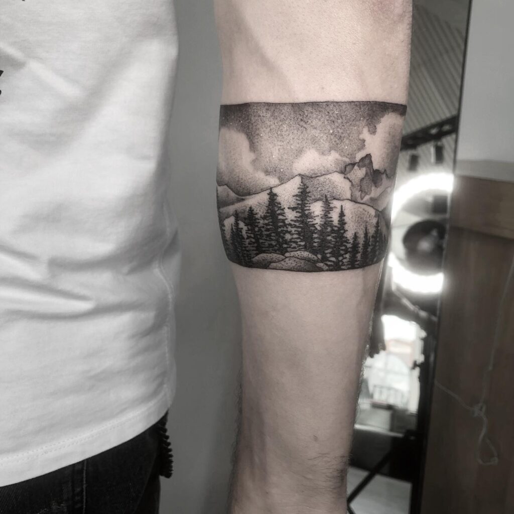 This concept works best on larger canvas areas like the upper arm, thigh, or back where there is room for detail. Black ink shading can create the illusion of moonlight casting shadows across the scene. The result is a tattoo that feels like a tiny painted world living on your skin.