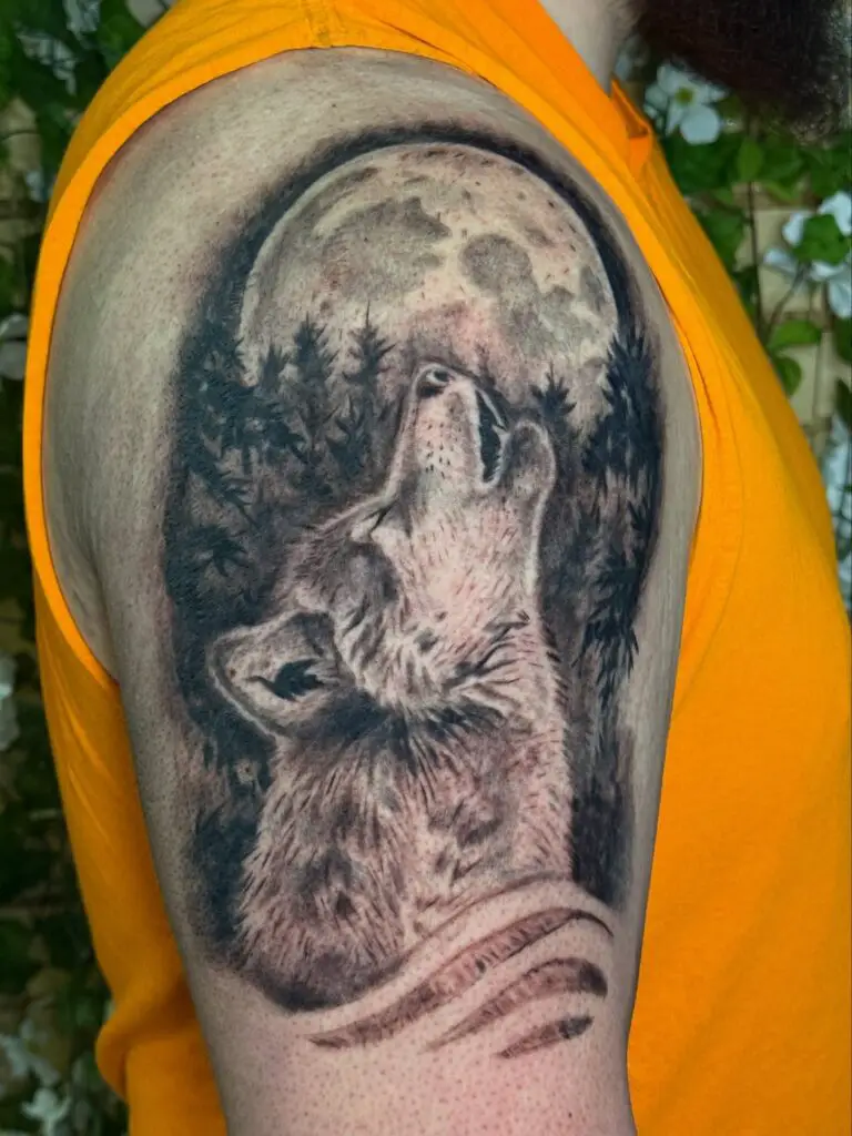 The wolf howling at the moon is an iconic pairing that speaks to wildness, freedom, and the untamed spirit within us all. Whether depicted as a silhouette against a full moon or rendered in detailed realism, this design carries enormous visual and emotional impact. Many people choose this tattoo to honor their connection to nature, their loyalty to family, or their independent spirit. A sleeve or back piece gives this dramatic composition room to tell its full story. Combined with a moody, forested background and deep black shading, a moon and wolf tattoo becomes truly unforgettable.