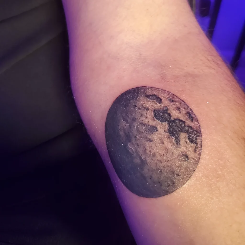 A photorealistic moon tattoo recreates the lunar surface in stunning detail, complete with craters, shadows, and the subtle gradation of light that makes the moon so visually compelling. Achieved through skilled grey wash shading and precise black ink technique, a realistic moon looks almost like a photograph embedded in the skin.