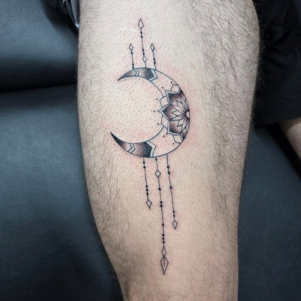 Sacred geometry overlays, such as the Flower of Life or interlocking diamonds, add an extra layer of meaning and complexity. This design shines on the forearm, calf, or shoulder where it has room to breathe. If you love structure and symmetry, this is the moon tattoo idea for you.