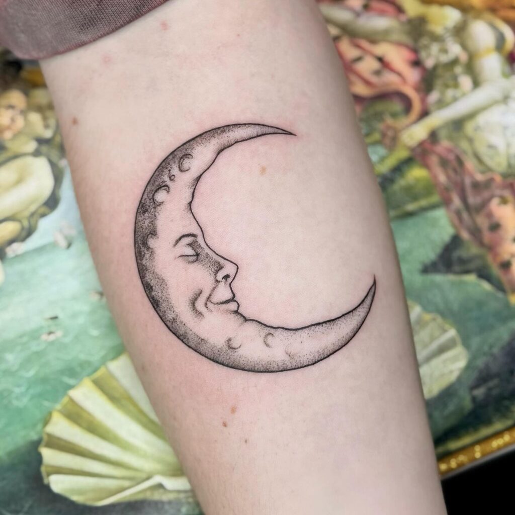 Artists can render this in classic black ink with stippling and crosshatching for a woodcut feel, or in a more modern illustrative style. This design works wonderfully on the upper arm or chest where its detail can be appreciated up close. It’s one of the most characterful moon tattoo ideas available.
