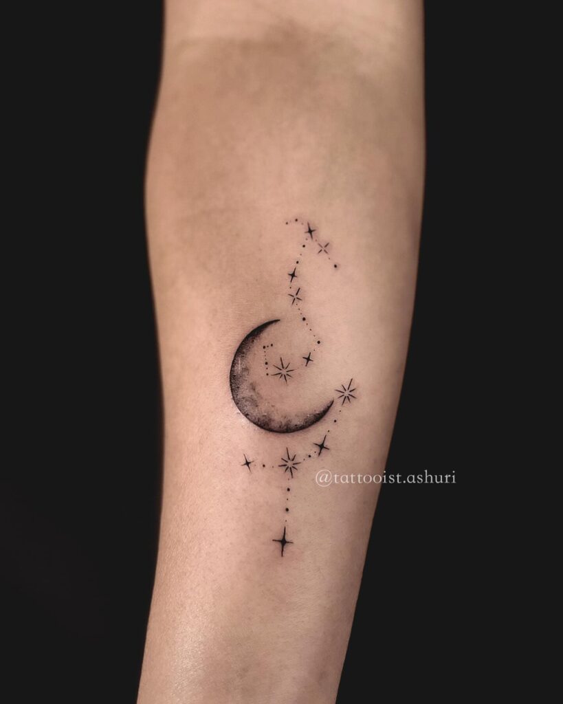 The crescent moon paired with a scatter of tiny stars is one of the most timeless moon tattoo ideas you can choose. This design works beautifully in fine black linework, creating a delicate and dreamy composition.