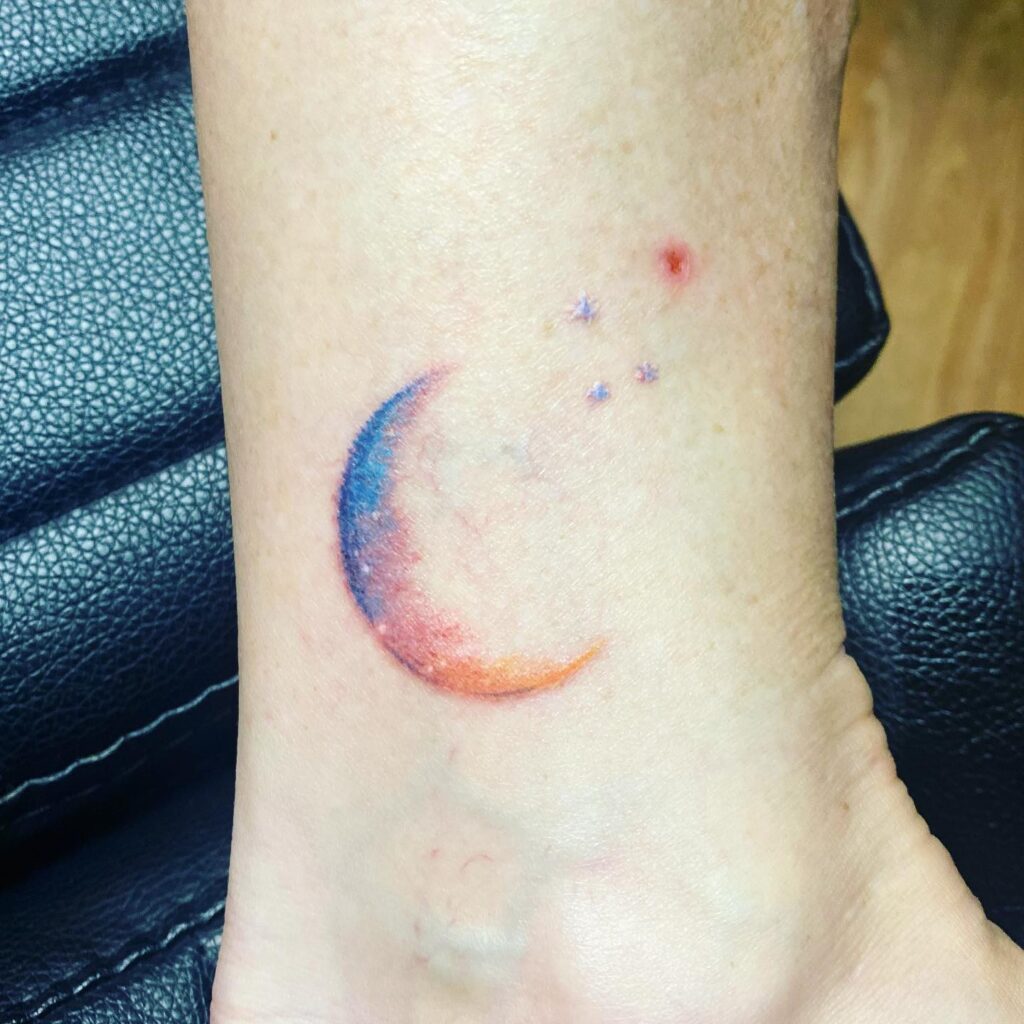 Watercolor moon tattoos explode with color, mimicking the loose, fluid appearance of paint brushed onto canvas. Blues, purples, pinks, and oranges bleed together to create a dreamy, ethereal effect that no other style can replicate.