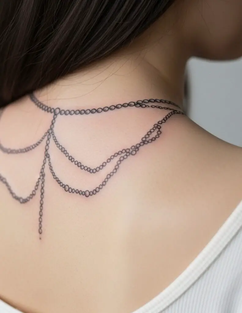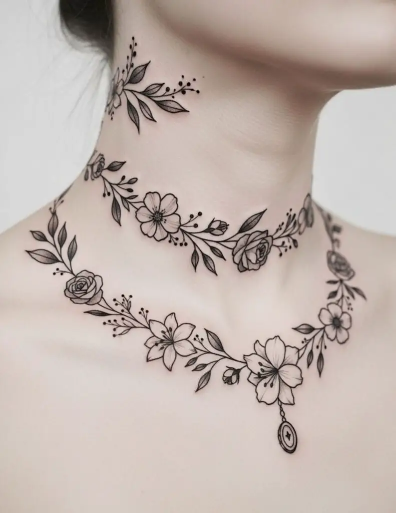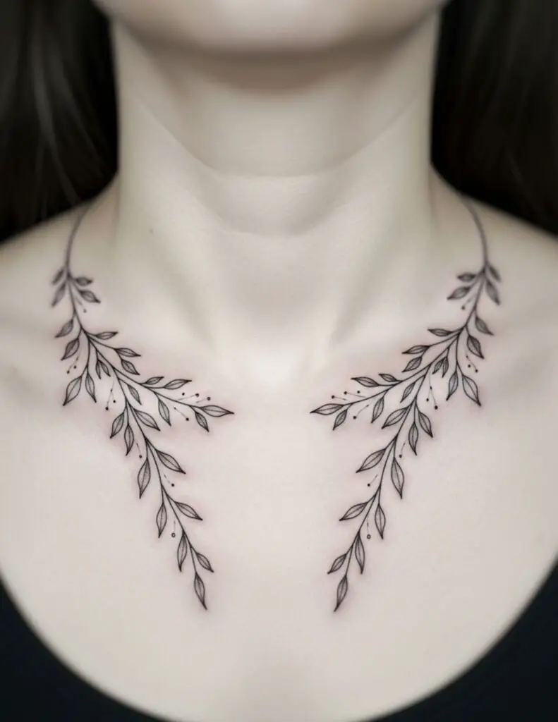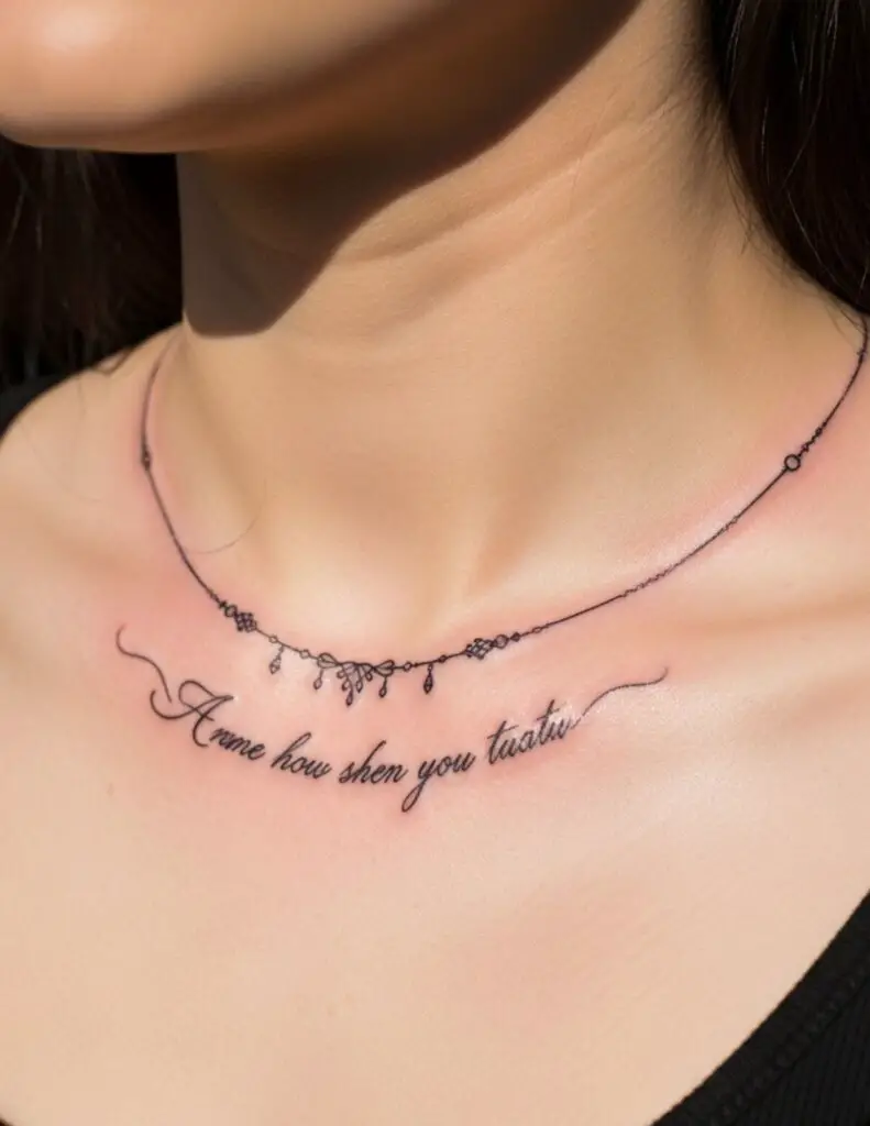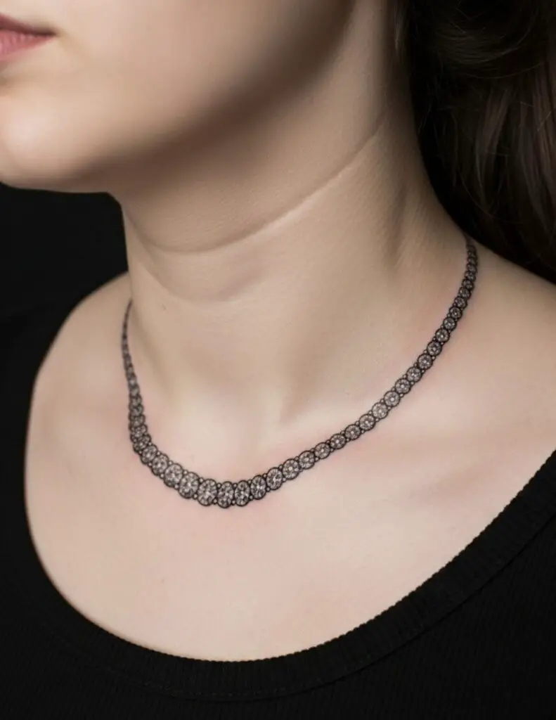 Necklace tattoos sit in two main zones: the collarbone area and the lower neck. Collarbone tattoos follow the horizontal line of the clavicle and are visible in most necklines. Lower neck tattoos circle the neck itself and are fully visible but also visible in professional settings. The design choice should consider which zone suits your lifestyle and clothing preferences before committing.