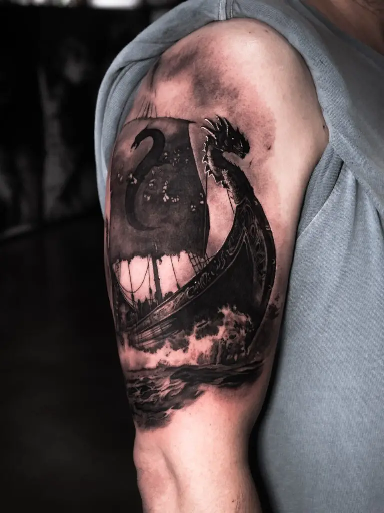Not a specific deity or symbol but a vessel of cultural weight. The Viking longship carried warriors across seas that most cultures would not have dared cross. As a tattoo image, it carries themes of ambition, navigation, and the willingness to move toward the unknown.
