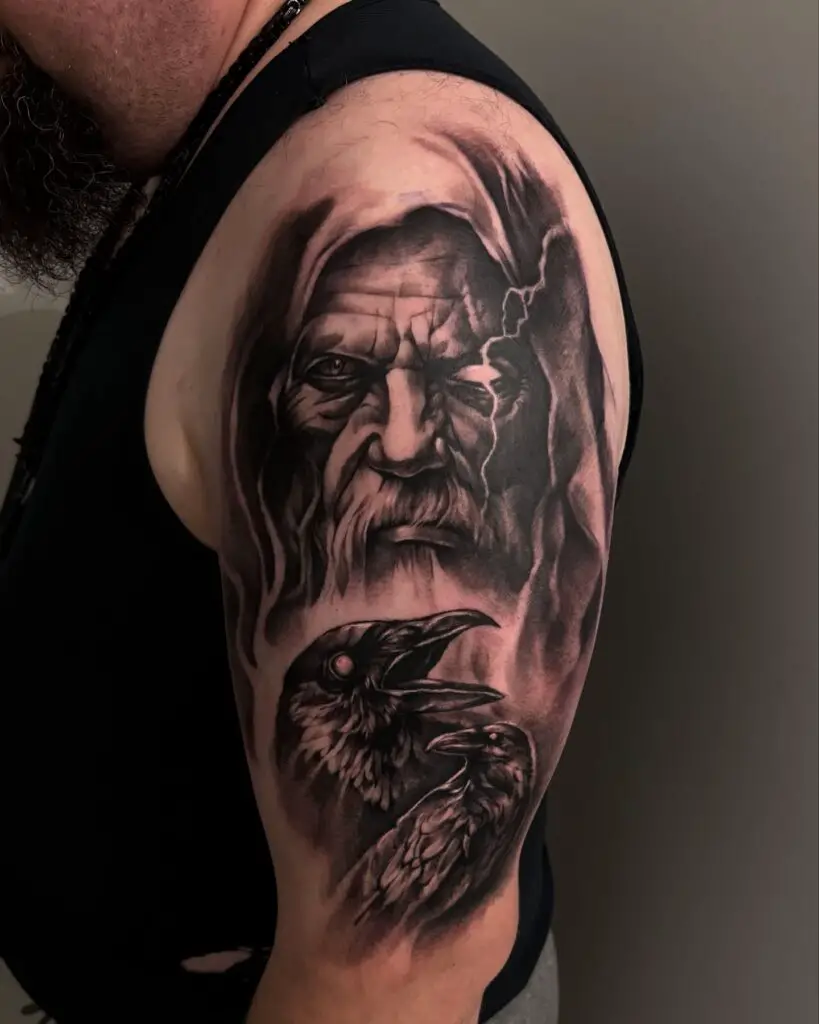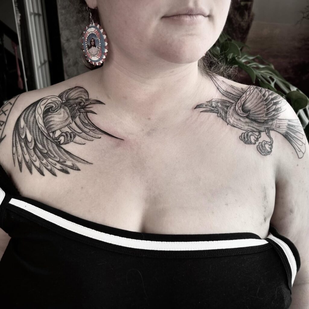 Hugin on one shoulder, Munin on the other. Thought on the left, Memory on the right. The symmetrical placement across the shoulders mirrors their function as extensions of Odin’s own perception. Powerful placement, powerful concept.