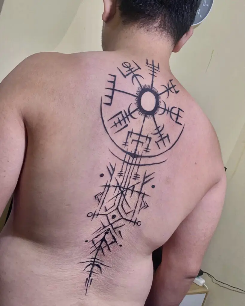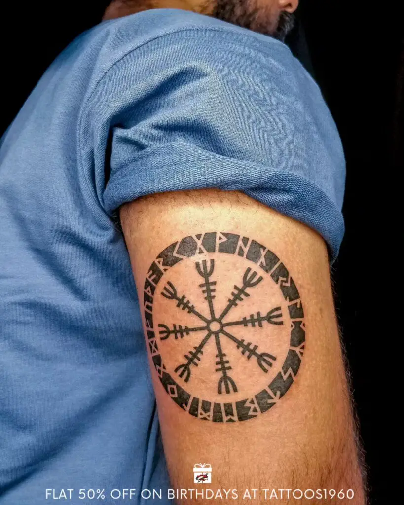 Eight tridents radiating from a central point. Warriors inscribed this on their foreheads before battle. As a tattoo, it carries that same protective and intimidating intention. Clean, angular, and immediately recognisable to anyone with knowledge of Norse symbolism.