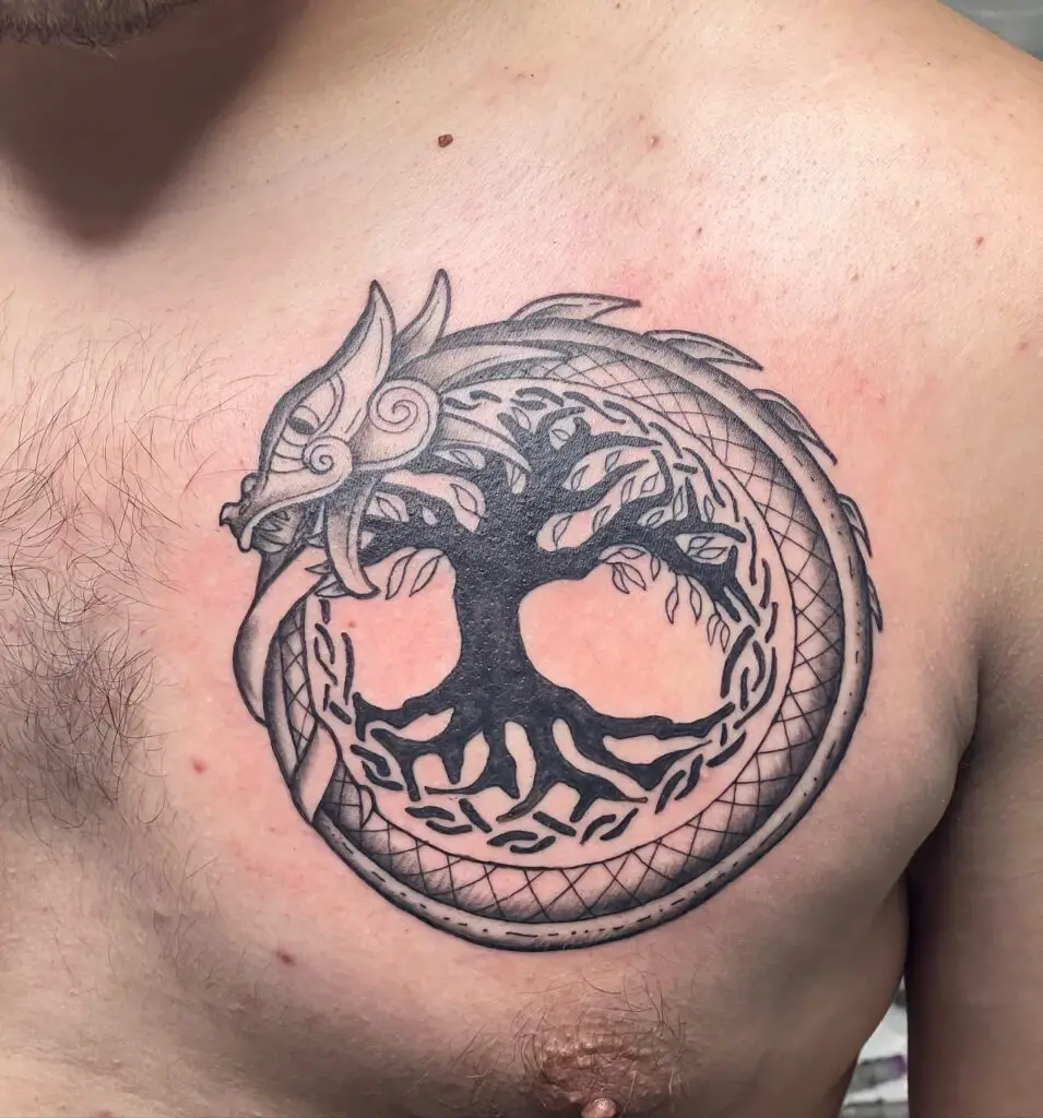 The world tree spanning from the roots of Hel’s realm to the branches holding Asgard. A full back piece allows Yggdrasil to exist at the scale it deserves. The roots intertwining with serpents below, the eagle at the crown, Ratatoskr the squirrel running up the trunk. There is enough detail in the mythology to fill a back and more.