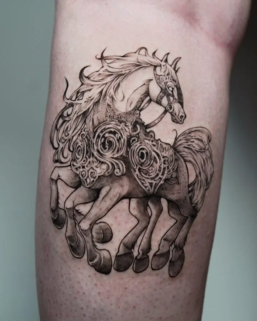 The fastest horse in the nine realms, son of Loki and Svaðilfari, with eight legs and the ability to travel between worlds. Sleipnir is rarely depicted in tattoo art despite being one of the most visually remarkable creatures in Norse mythology. An unusual and memorable choice.