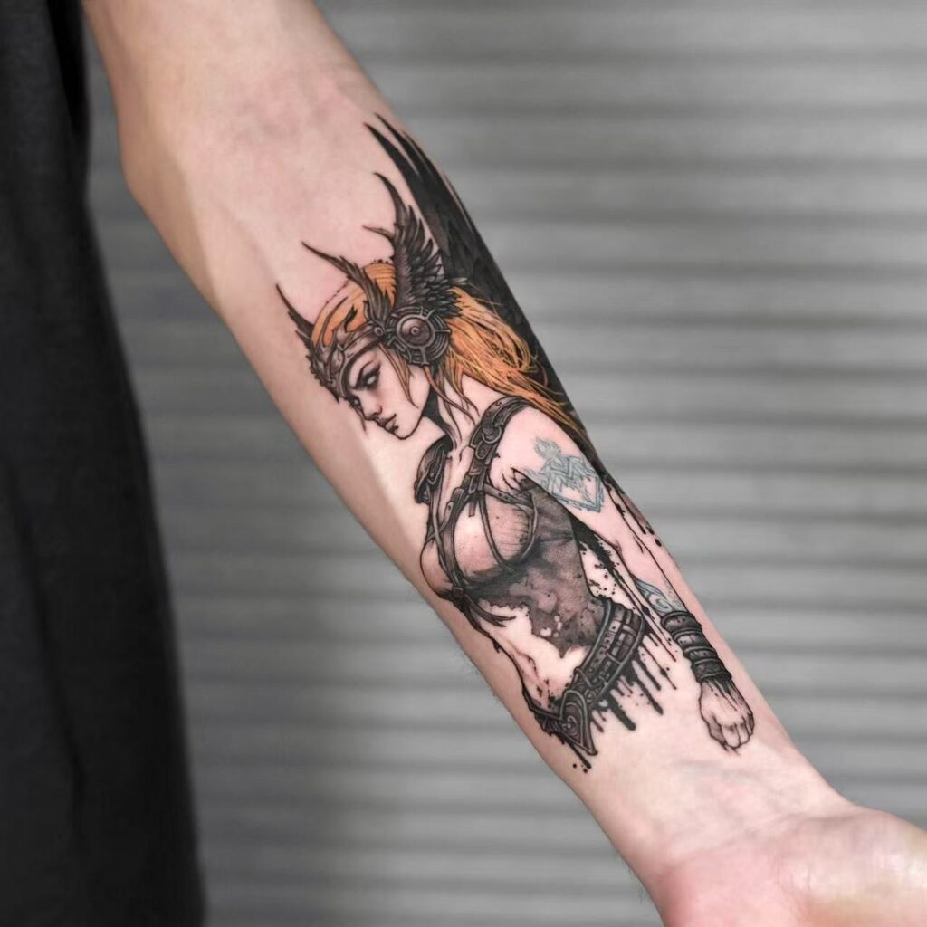 A Valkyrie, armoured and winged, moving across a battlefield. The Valkyries chose who lived and who died in battle and escorted the worthy to Valhalla. They are not gentle figures. They are decisive and fearless. A Valkyrie tattoo is an unusual choice for a warrior archetype: feminine, lethal, and serving the highest purpose.