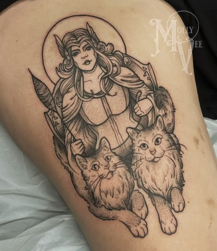 Freya, goddess of love, war, and magic, rides in a chariot pulled by two cats and wears the necklace Brisingamen. She is often overlooked in favour of male deities but she is among the most powerful figures in the pantheon. A Freya tattoo is an unusual and genuinely interesting choice.