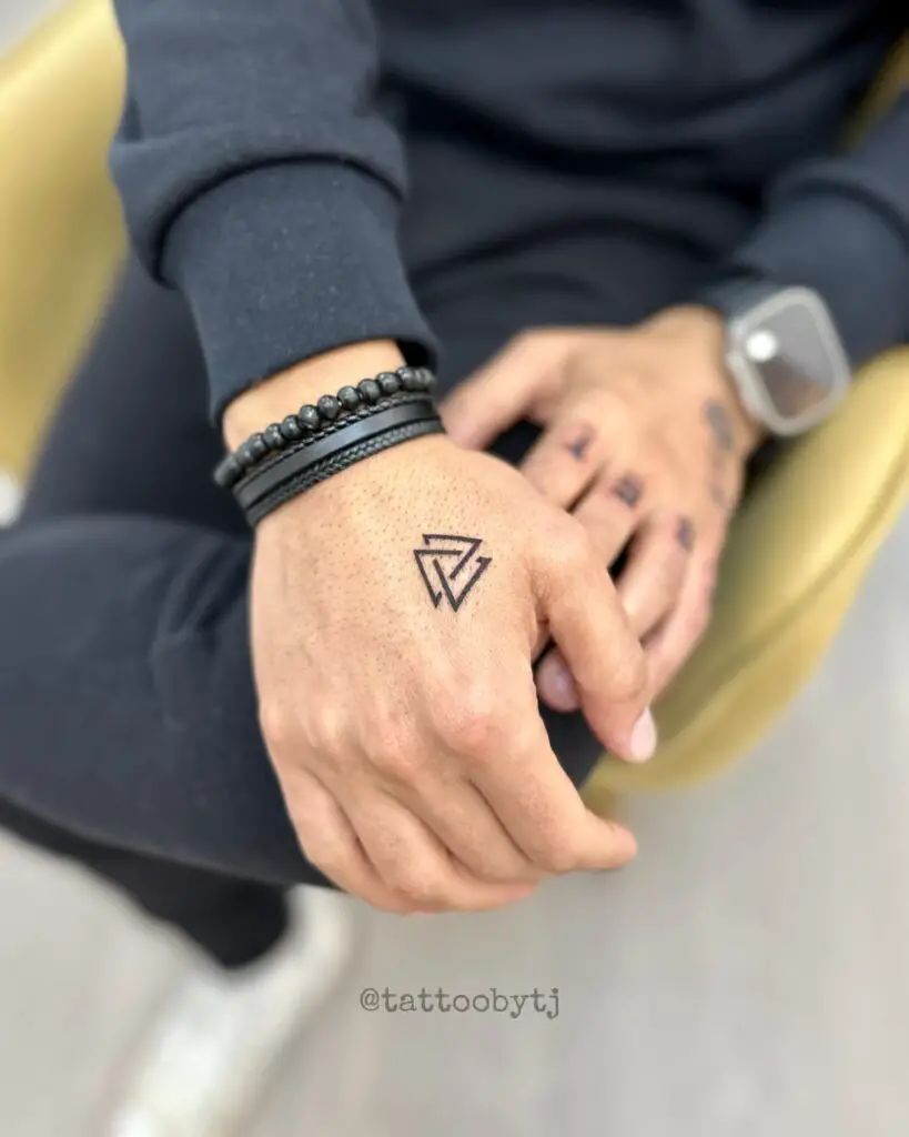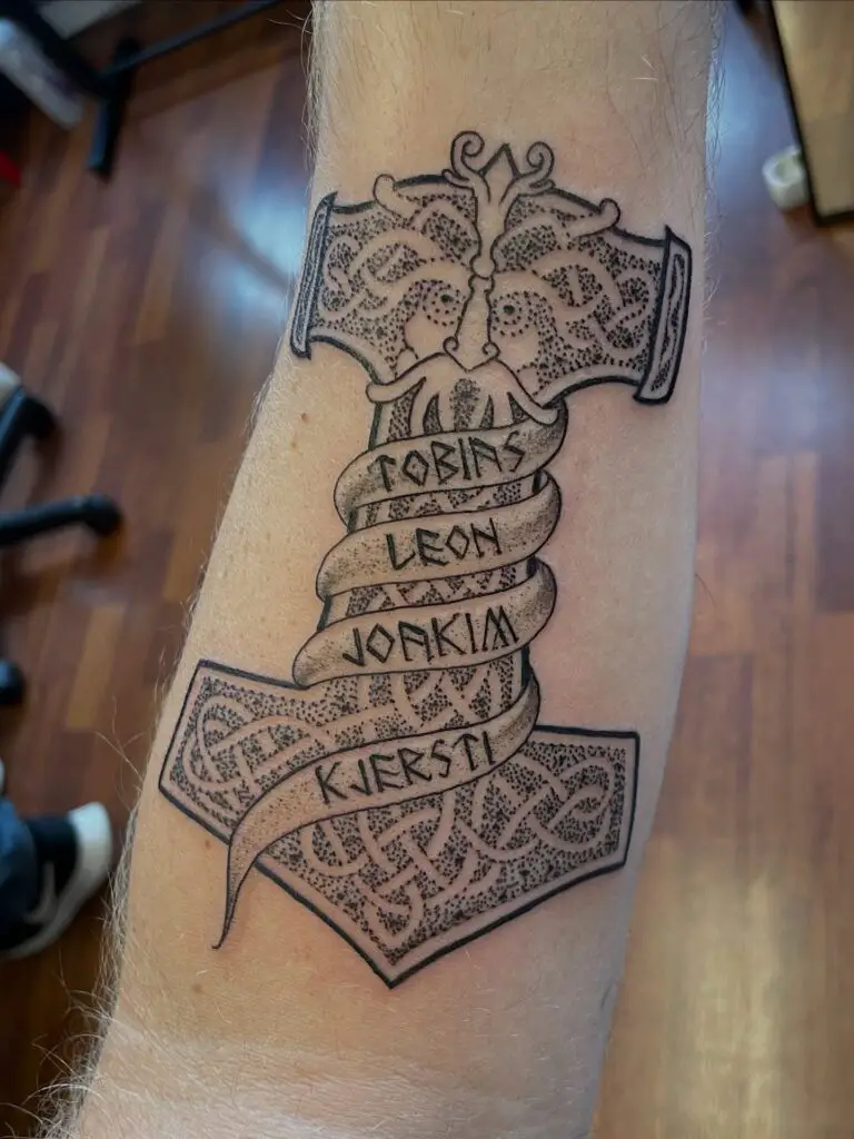 Thor’s hammer rendered in detailed knotwork interlacing. The historical Mjölnir pendants found across Scandinavia are often surprisingly small and geometric. A tattoo version can honour that historical accuracy or expand it into something more dramatic. Either works.