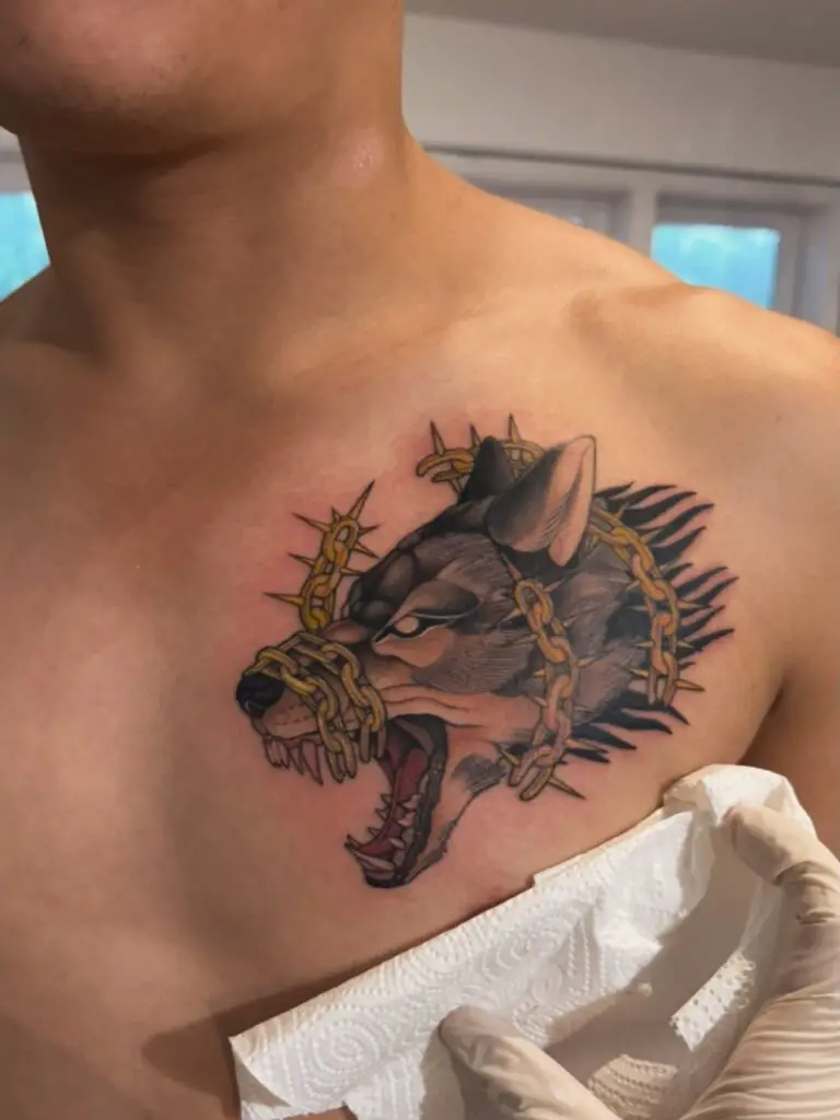 The great wolf Fenrir, bound by Gleipnir, the impossibly thin chain that holds what iron could not, straining against his bonds. Fenrir is the embodiment of inevitable catastrophe. His breaking free signals Ragnarok. As a tattoo, the wolf straining against restraint carries obvious symbolism around power, defiance, and the things that cannot be contained forever.