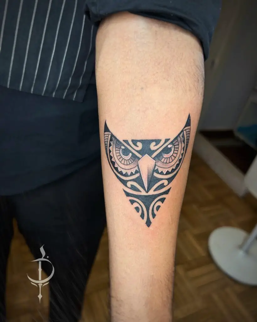 An owl’s form rendered in bold tribal linework, using traditional Pacific or Maori-influenced patterns to fill the shape. The tribal treatment is unapologetically graphic and creates a design with significant visual weight.