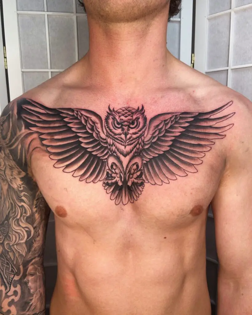 A large, symmetrical owl face in solid black ink, positioned at the chest’s centre. Imposing. The symmetry of an owl’s face works almost architecturally when centred on the sternum. Bold choice, exceptional result with the right artist.