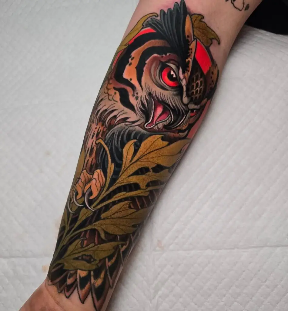 Bold outlines, flat colour fills, heavily stylised feathers. The traditional American approach to owl portraiture is confident and graphic. The black outlines hold for decades and the palette of red, yellow, and green ages with integrity.