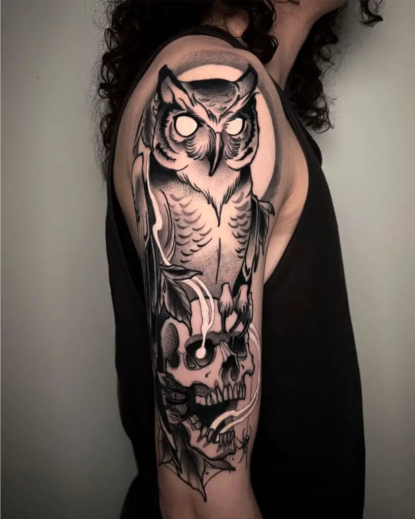 A classic pairing in traditional tattoo iconography. The owl perched atop a human skull. Wisdom sitting above mortality. Or the opposite reading: death presided over by knowledge. The tension between the two symbols produces something more complex than either alone.