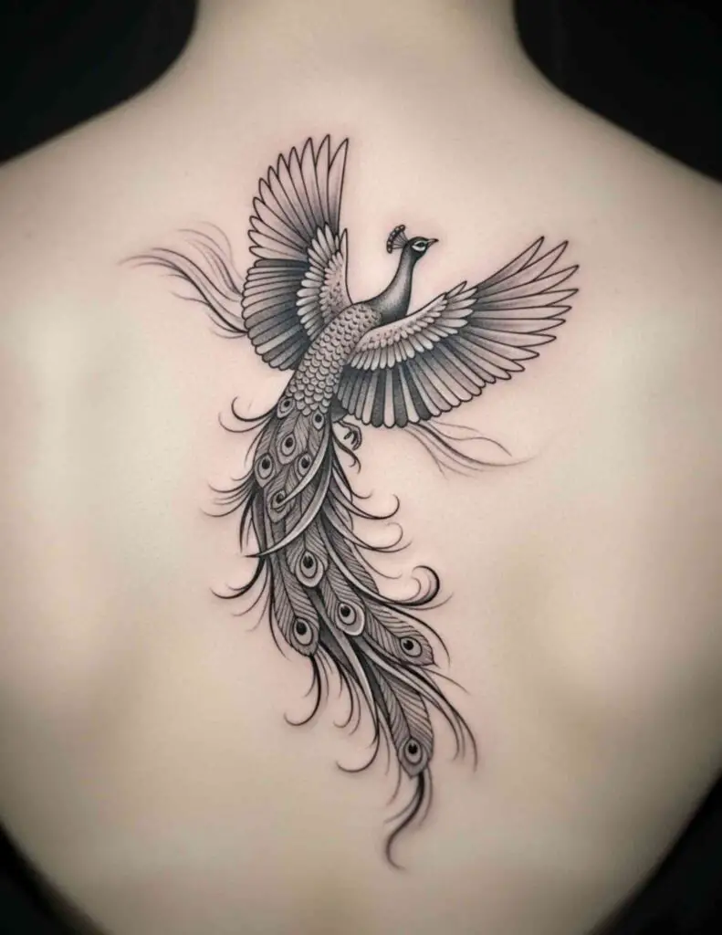A peacock in flight, a relatively rare orientation in tattoo art, with wings spread and tail trailing. The peacock in flight is less commonly depicted in tattoo art than in display, which makes it unusual and more interesting. The wingspan combined with the trailing tail produces a long, sweeping composition.