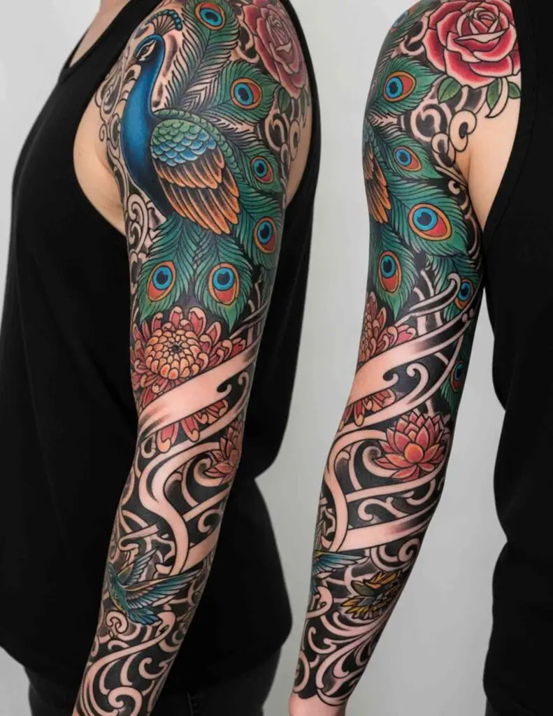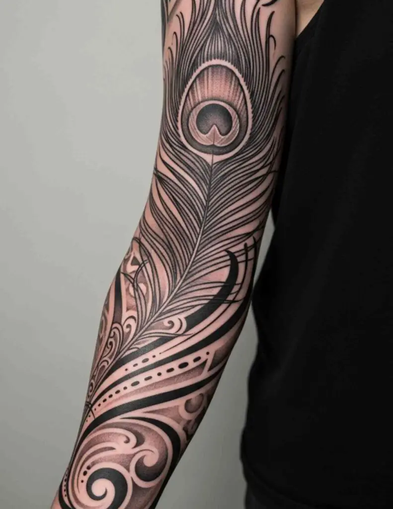 Multiple peacock feathers arranged across a full or half sleeve. The feather’s natural gradient from the quill through the barbules to the eye creates a built-in progression of detail. Several feathers at different angles fill a sleeve with colour and pattern that has no equivalent in other floral or botanical designs.