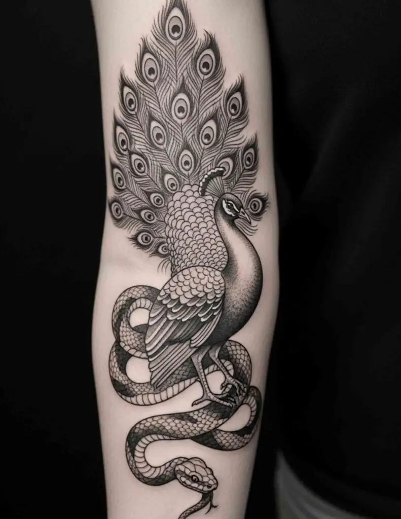 In Hindu mythology, peacocks eat snakes and are immune to their venom. A peacock and snake paired in a tattoo carries that specific symbolic relationship: the beautiful that overcomes the dangerous, the divine that is not threatened by what harms lesser creatures.