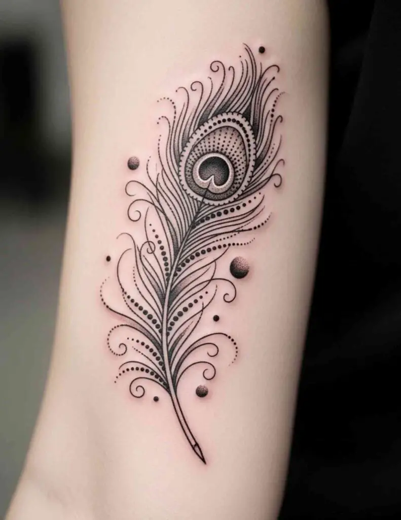 A peacock feather built entirely from stippled dots, the density of the dotwork creating the feather’s colour gradients without any line or fill. The technique creates a texture that photographs extraordinarily well and ages with integrity. The eye of the feather in dense dotwork is particularly striking.