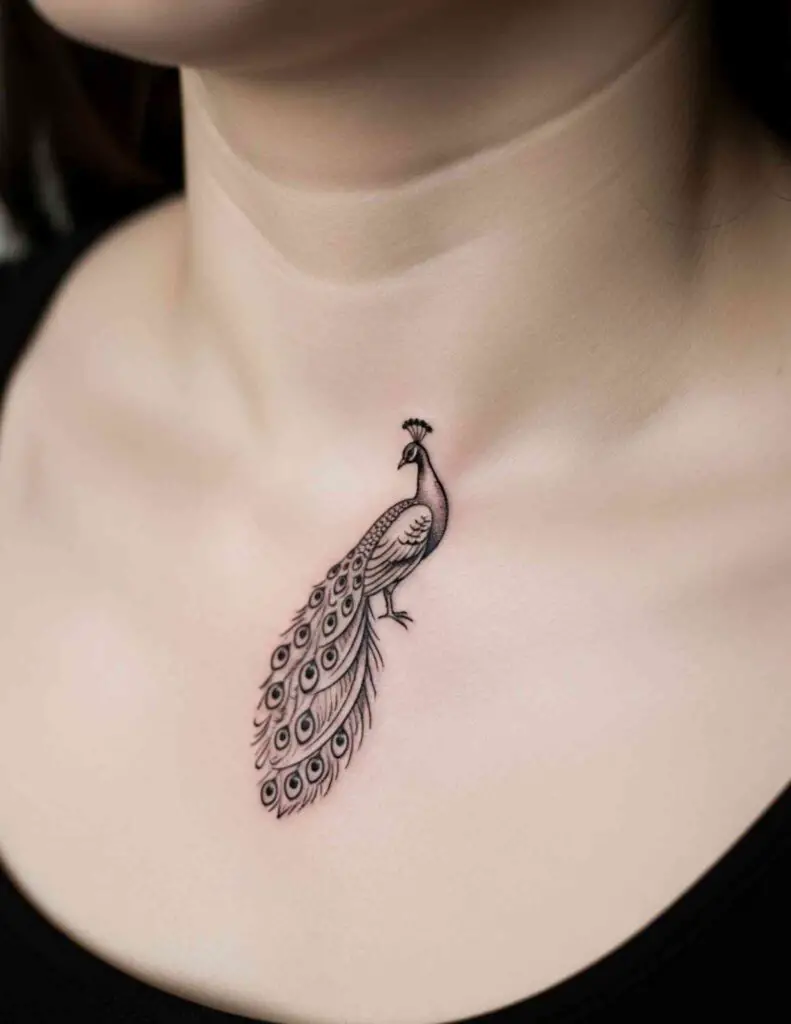 Peacock feathers arranged across the collarbone area, with the eyes of the feathers facing upward. The feathers spread outward from the centre like a natural collar. Visible at low necklines, dramatic at the beach. Requires careful planning with an artist who understands placement on this specific area.