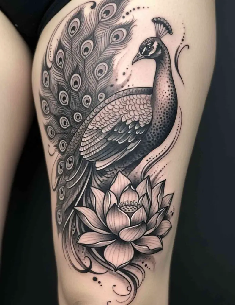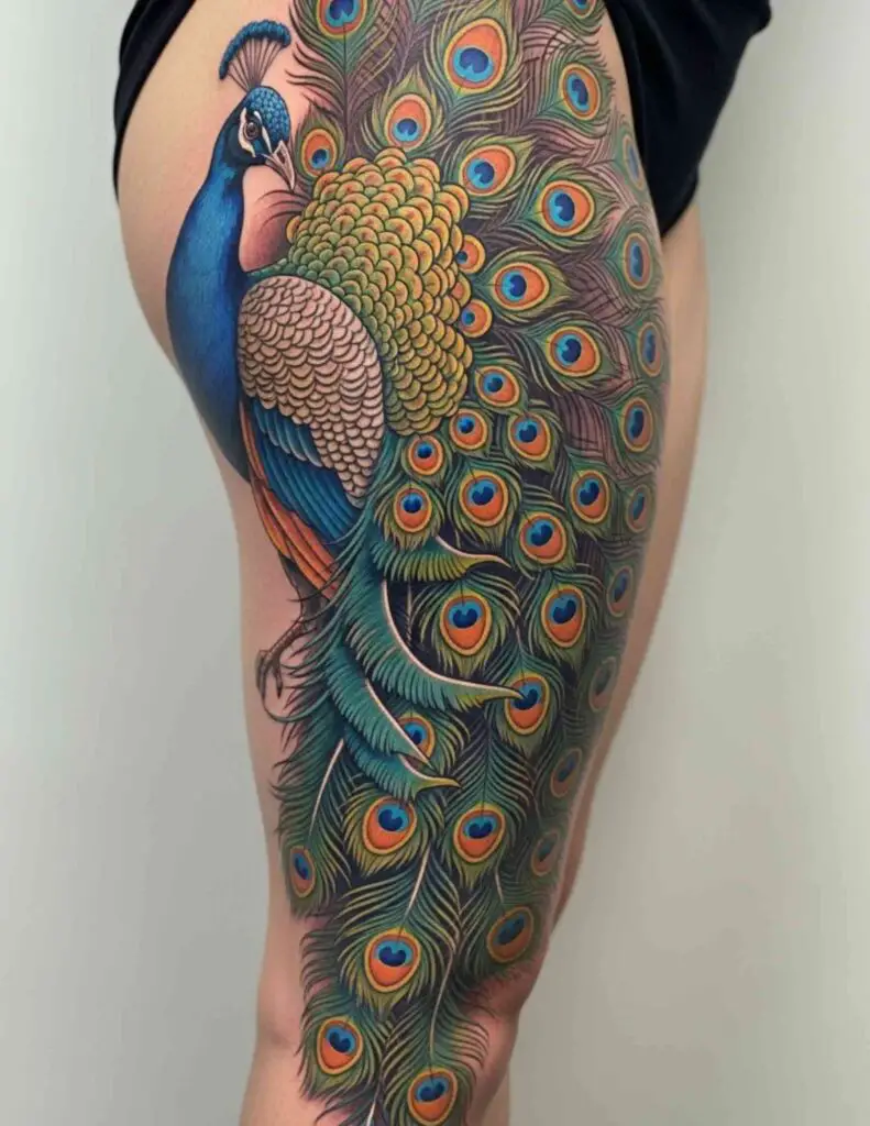 A peacock arrangement filling the thigh. The thigh’s large flat surface provides room for the tail’s expansion without the compositional constraints of smaller placements. A single bird or a cluster of feathers covering the thigh produces a genuinely impressive result.
