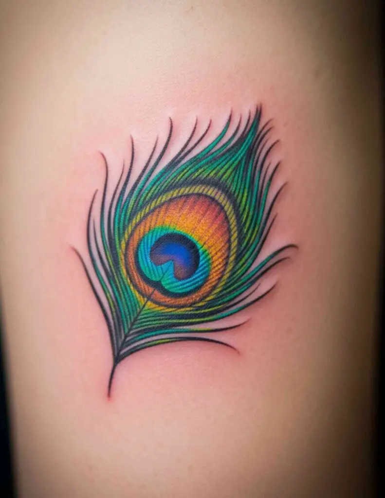 Not the full feather but the eye: the central ocellus of a peacock feather, the concentric rings of blue, green, and gold that give the feather its appearance of watching. A single feather eye as a tattoo is an unusual and symbolically rich choice: the eye of divine watchfulness, the beauty of display, all contained in a single element.