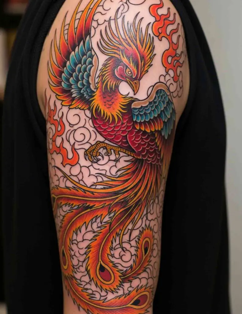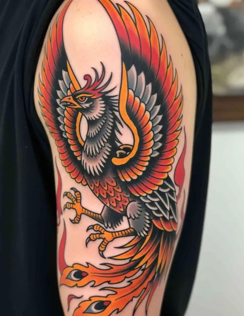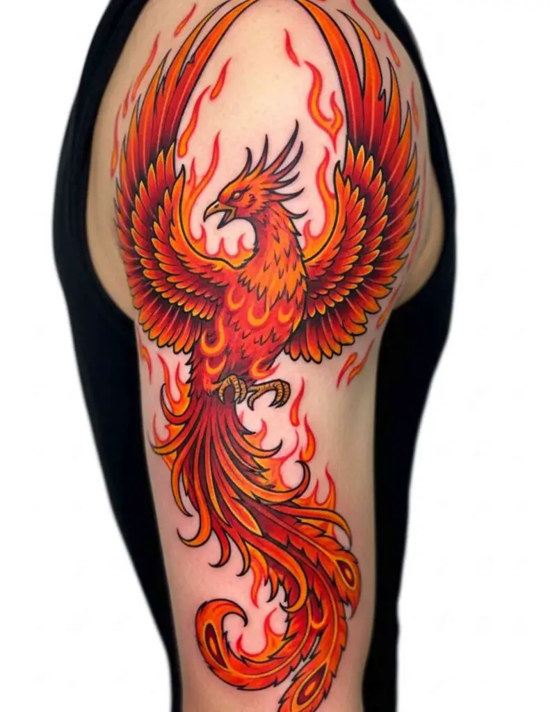 A phoenix in neo-traditional style: slightly exaggerated proportions, rich jewel-toned colour, dimensional illustrative quality, and the bold line confidence of the tradition. Neo-traditional gives the phoenix a contemporary energy while maintaining the craft and visual weight of traditional tattooing.
