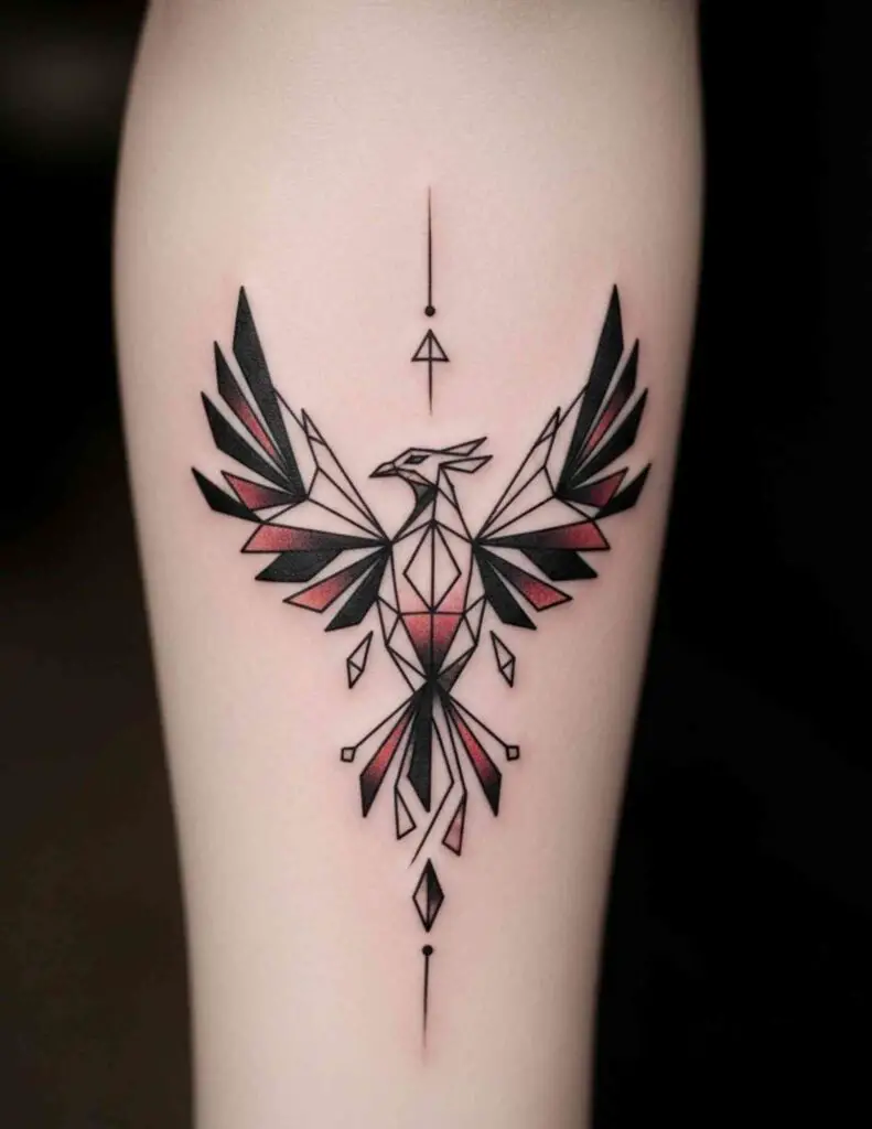 A phoenix constructed from geometric planes and angular forms. The faceted triangular planes of the geometric style create a bird that looks built from the same material as light and fire. The geometric treatment suits the phoenix’s associations with precision and transformation.